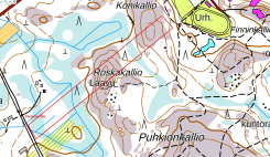 Talviaikainen kävelyreitti urheilualueen kalliomaastossa