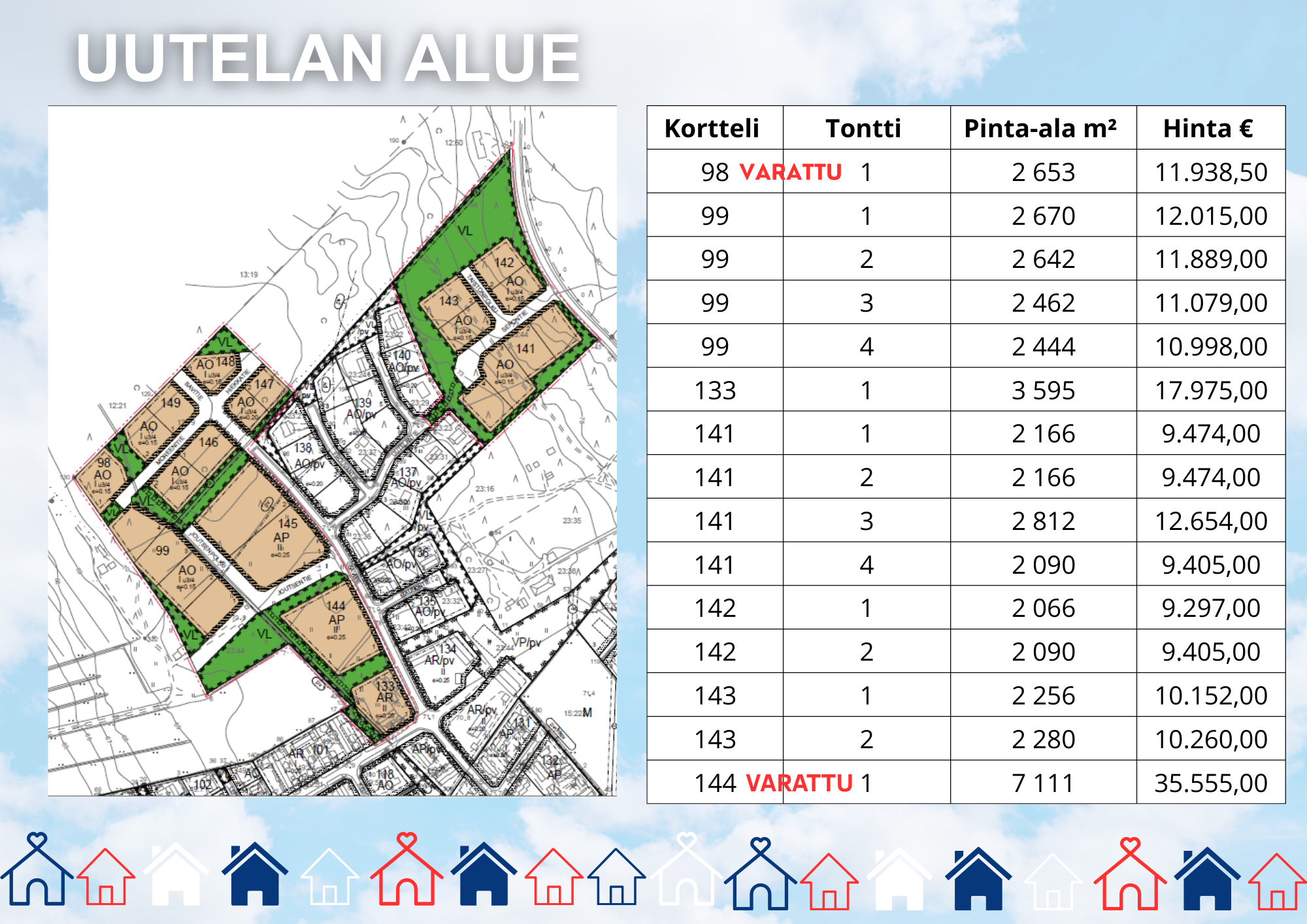 Uutela, Kansanopisto, Mikontanhua, Maijankoivikko: Tonttien varausmaksu on 300,00 €, varaus on voimassa yhden vuoden ja se huomioidaan lopullisessa kauppahinnassa. Varausmaksua ei palauteta, mikäli varaaja peruuttaa varauksensa.